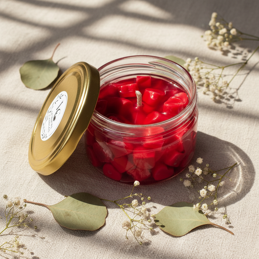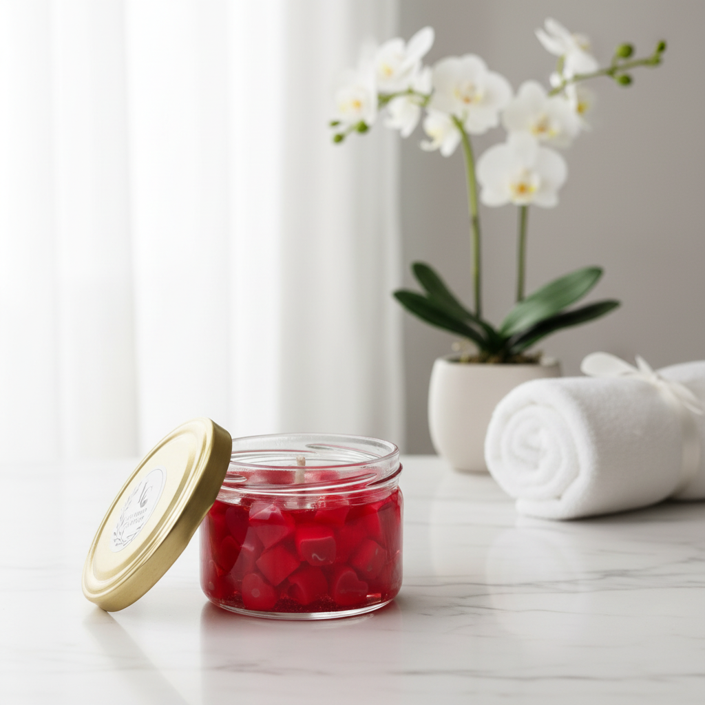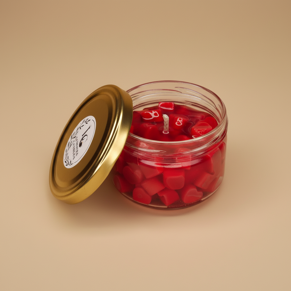 The Dreamy Hearts Jar Candle is designed to celebrate love, warmth, and intimate moments. Featuring delicate heart-shaped embeds suspended beautifully in a clear jar, this candle creates a visually captivating glow when lit. Crafted using a premium blend of soy wax and gel wax, it delivers both aesthetic elegance and long-lasting performance.